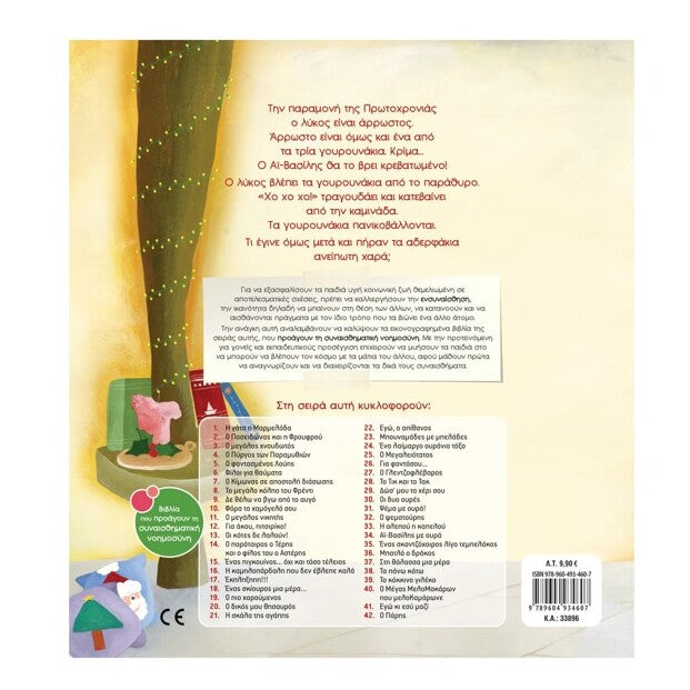 Το βιβλίο: Την παραμονή της Πρωτοχρονιάς ο λύκος είναι άρρωστος. Άρρωστο είναι όμως και ένα από τα τρία γουρουνάκια. Κρίμα… Ο Αϊ-Βασίλης θα το βρει κρεβατωμένο! Ο λύκος βλέπει τα γουρουνάκια από το παράθυρο. «Χο χο χο!» τραγουδάει και κατεβαίνει από την καμινάδα. Τα γουρουνάκια πανικοβάλλονται. Τι έγινε όμως μετά και πήραν τα αδερφάκια ανείπωτη χαρά;