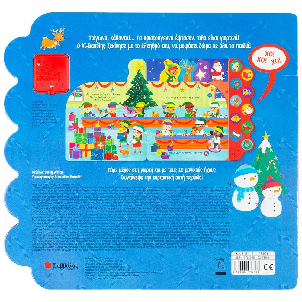 Τρίγωνα, κάλαντα!... Τα Χριστούγεννα έφτασαν. Όλα είναι γιορτινά! Ο Αϊ-Βασίλης ξεκίνησε με το έλκηθρό του, να μοιράσει δώρα σε όλα τα παιδιά! Πάρε μέρος στη γιορτή και με τους 10 μαγικούς ήχους του βιβλίου ζωντάνεψε την εορταστική αυτή περίοδο!