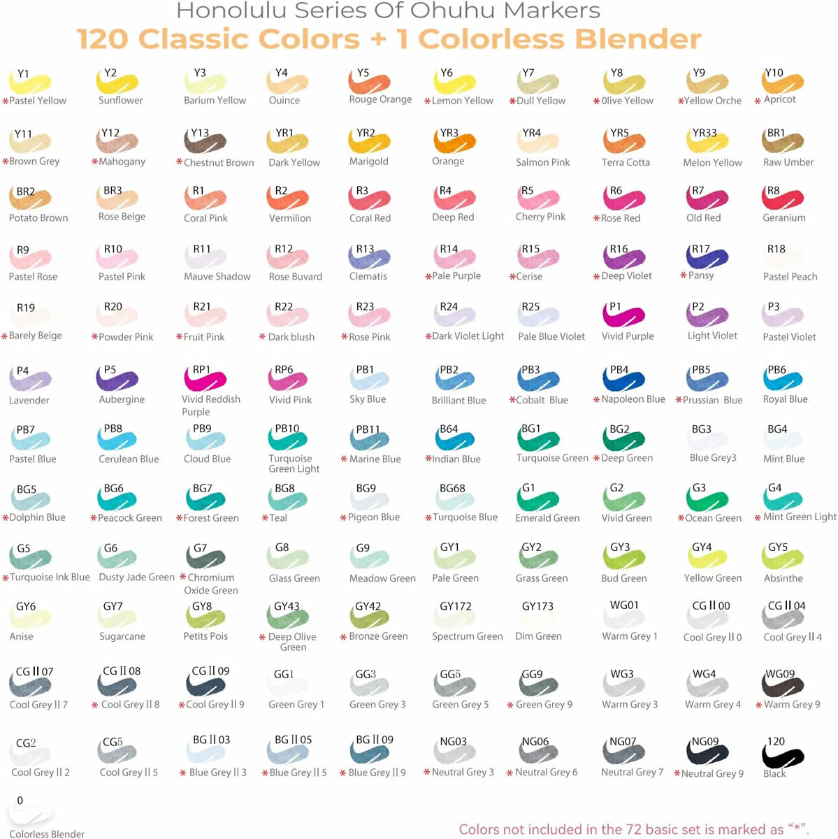 The set comes in a beautiful black fabric case and includes 121 markers (120 colors and 1 colorless Blender) with a dual-tip Brush & Fine alcohol-based tip.