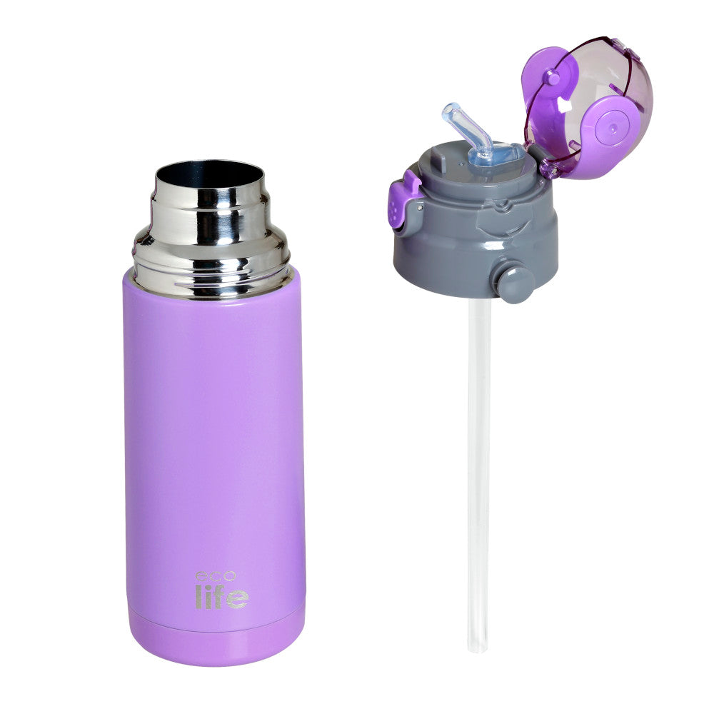 High-quality stainless steel children's thermos flask from Eco Life, in lilac, with an internal straw for greater convenience. Made of top-quality 304 (stainlesssteel 18/8) steel, which offers a guarantee and safety, without toxic substances, without aluminum.