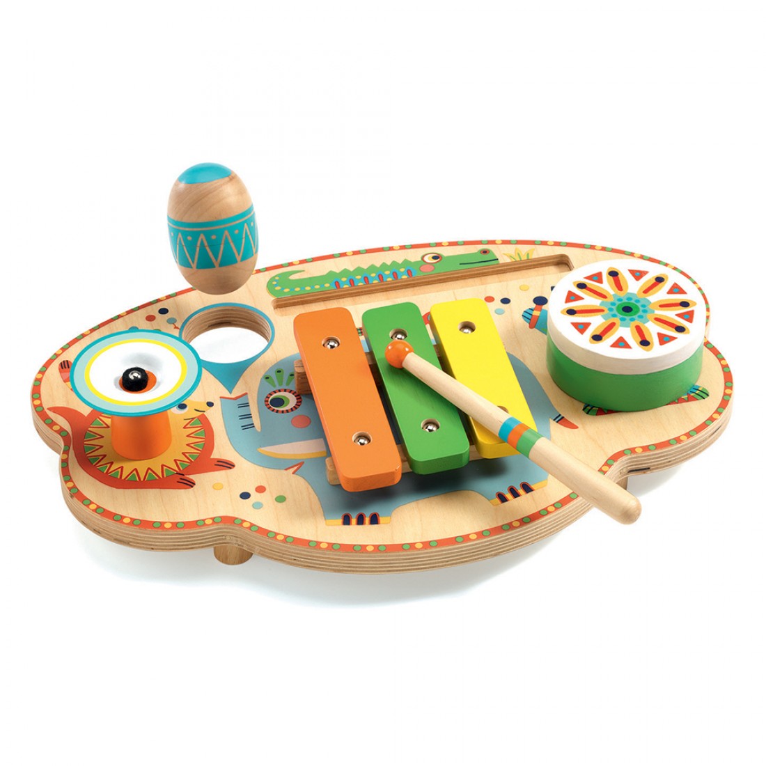 The set adds its own colorful touch to the Animambo series. The base includes a xylophone, drum, cymbal, and maraca. Its colors are non-toxic and water-based, and its varnishes are eco-friendly, making it suitable for children aged 2 and above.