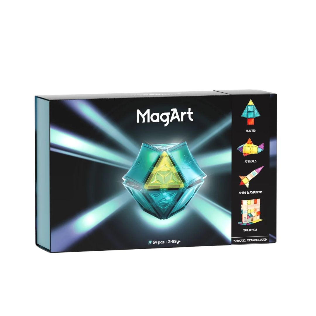 With 64 colorful magnetic tiles from TopBright, children can create amazing structures, from simple geometric shapes to impressive three-dimensional creations. Whether it's a rocket, cute animals, or exciting buildings, MagArt turns everyone into architects.