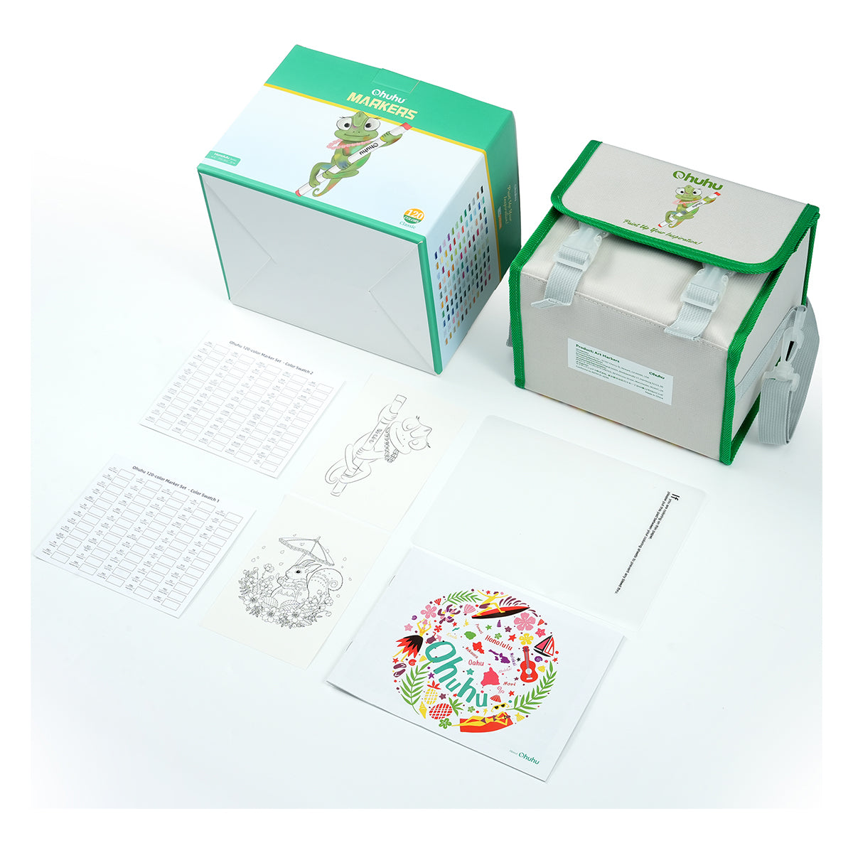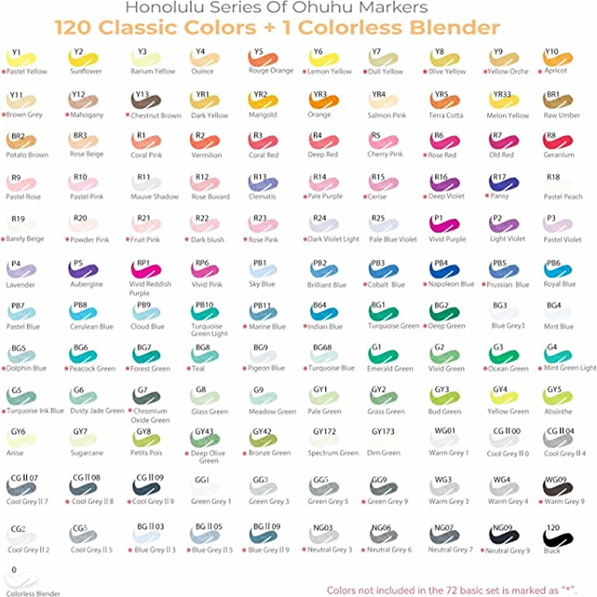 The Ohuhu set comes in a beautiful case and includes 121 markers (120 colors and 1 colorless BLENDER) with a dual tip. Brush & Chisel which are alcohol-based.