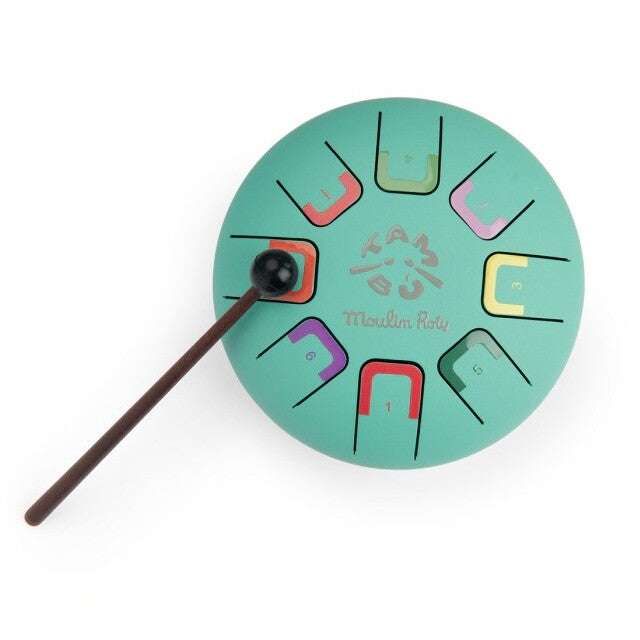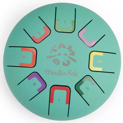 A real musical instrument to introduce children to percussion! This Metal Tongue Drum, from the company Moulin Roty, has 8 notes indicated by a color and a number. There are various ways to play: with fingers, hands, or using the included mallets. The drum comes with a booklet of melodies and 4 stickers. Suitable for children +3 years old.