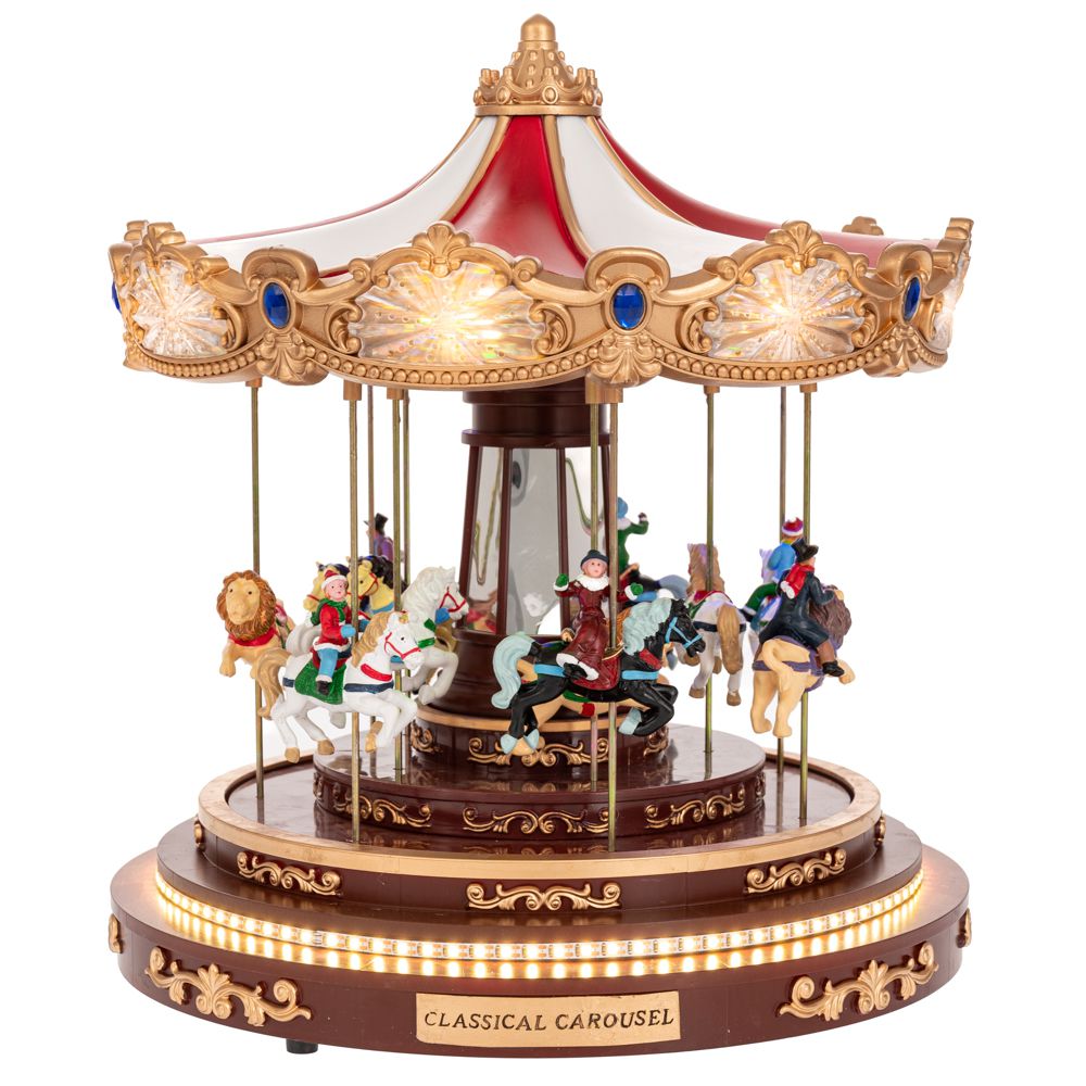 Christmas Carousel in brown color. Its elaborate construction is adorned with gold details as well as perimeter LED lights on its base. In the center it has a decorated column and around it go up and down happy figures of children on horses and lions. It plays music that has an On/Off button. It operates on electricity with a 4.5V transformer which is included. Very good display and quality of construction. The product may have slight color differences from the photo.