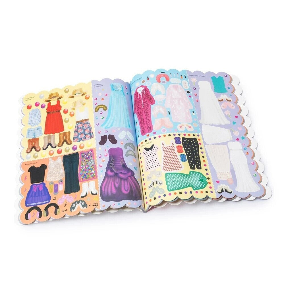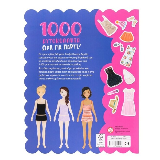 Οι τρεις φίλες Μαρίνα, Ισαβέλλα και Αιμιλία τρελαίνονται για πάρτι και γιορτές! Βοήθησέ τες να ντυθούν κατάλληλα με περισσότερα από 1.000 φανταστικά αυτοκόλλητα μόδας.