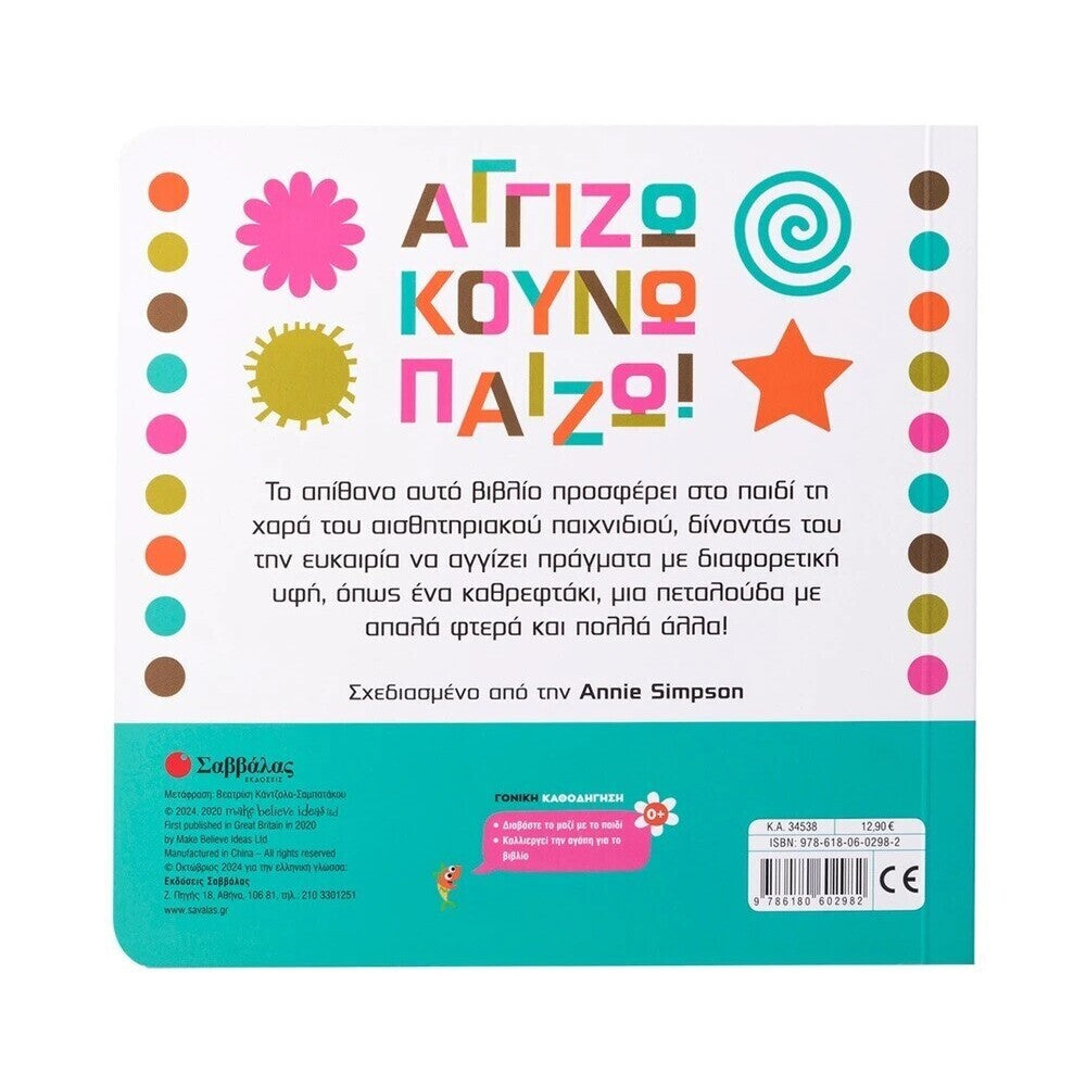 Το απίθανο αυτό βιβλίο προσφέρει στο παιδί τη χαρά του αισθητηριακού παιχνιδιού, δίνοντάς του την ευκαιρία να αγγίζει πράγματα με διαφορετική υφή, όπως ένα καθρεφτάκι, μια πεταλούδα με απαλά φτερά και πολλά άλλα!