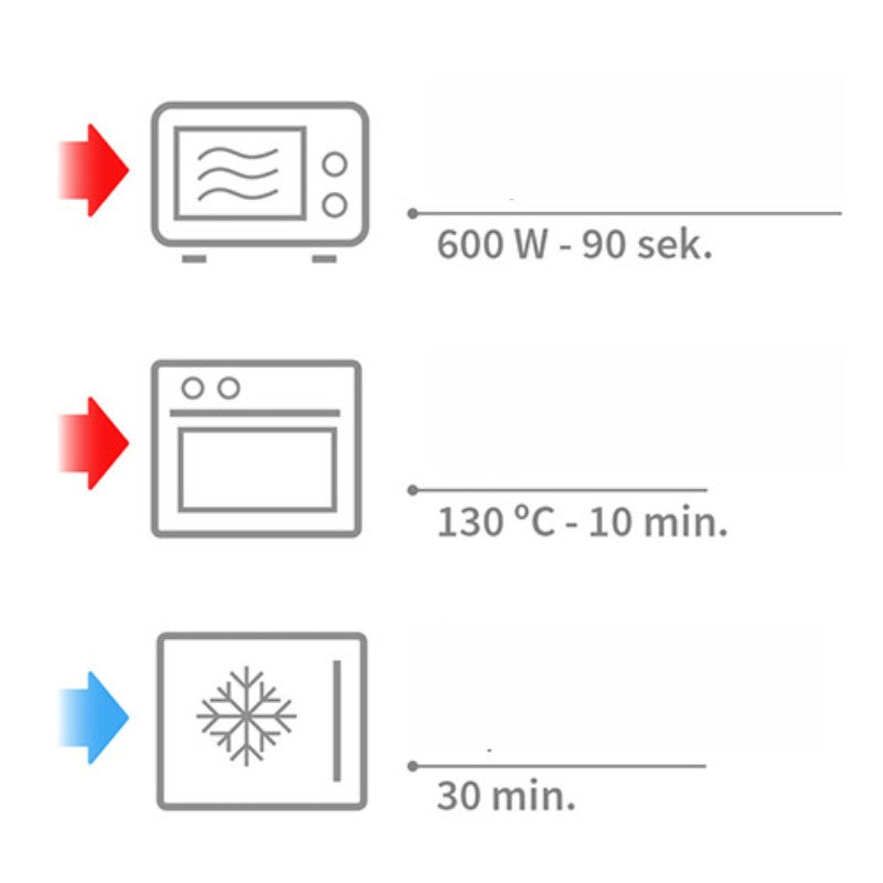 • Αφαιρέστε το εξωτερικό κάλυμα και τοποθετήστε το σακουλάκι στο φούρνο μικροκυμάτων ->  (600 W - 90 δευτερόλεπτα). Στον φούρνο -> (130° C - 10 λεπτά)  ή στο καλοριφέρ μέχρι να ζεσταθεί πολύ καλά.