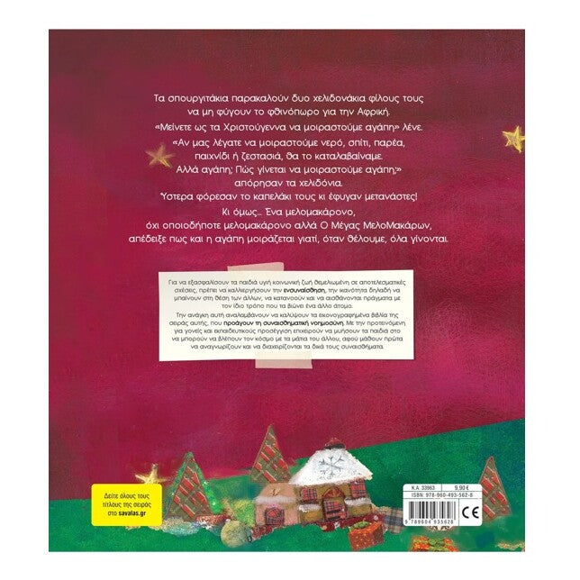Το βιβλίο: Τα σπουργιτάκια παρακαλούν δυο χελιδονάκια φίλους τους να μη φύγουν το φθινόπωρο για την Αφρική. «Μείνετε ως τα Χριστούγεννα να μοιραστούμε αγάπη» λένε. «Αγάπη; Πώς γίνεται να μοιραστούμε αγάπη;» απόρησαν τα χελιδόνια. Κι όμως… ένα ξεχωριστό μελομακάρονο απέδειξε πως και η αγάπη μοιράζεται!
